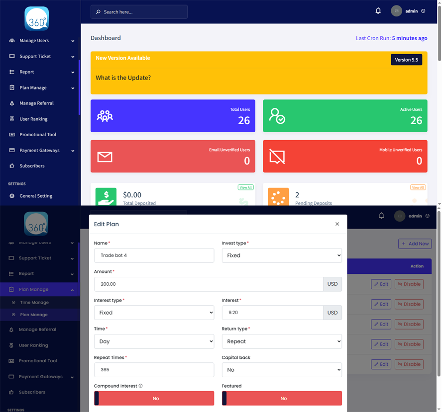 简单的介绍下该套软件的制度吧,还是前端和后端都是英文的,后端发布项目设置好投资机器人的参数和返利比例,前端会员充值购买投资分红,也就是这么简单的模式,同时还有就是带三级推荐奖励,5%、3%、1%可以自己进行设置,其实后端还有很多功能可开启,比如机器人也可以设置复投模式,还有投资佣金和利息佣金的奖项可开启。可以根据自己的需求是否开启就是了。